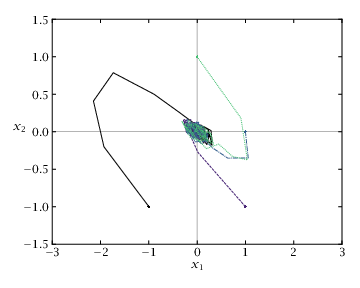 Closed-loop robust MPC state evolution with uniformly distributed \left | w \right | \leq 0.1 from four different x_0.